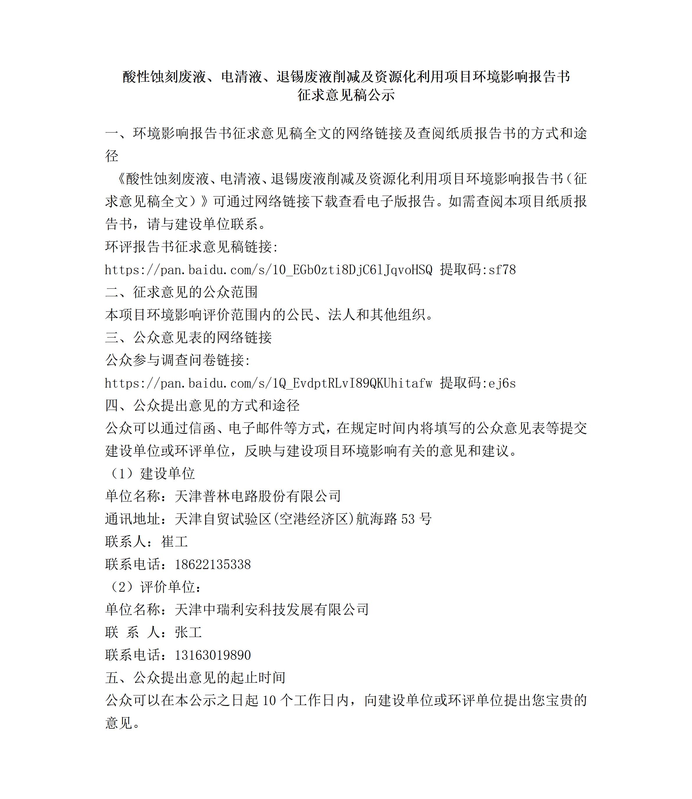 酸性蝕刻廢液、電清液、退錫廢液削減及資源化利用項目環(huán)境影響報告書征求意見稿公示
